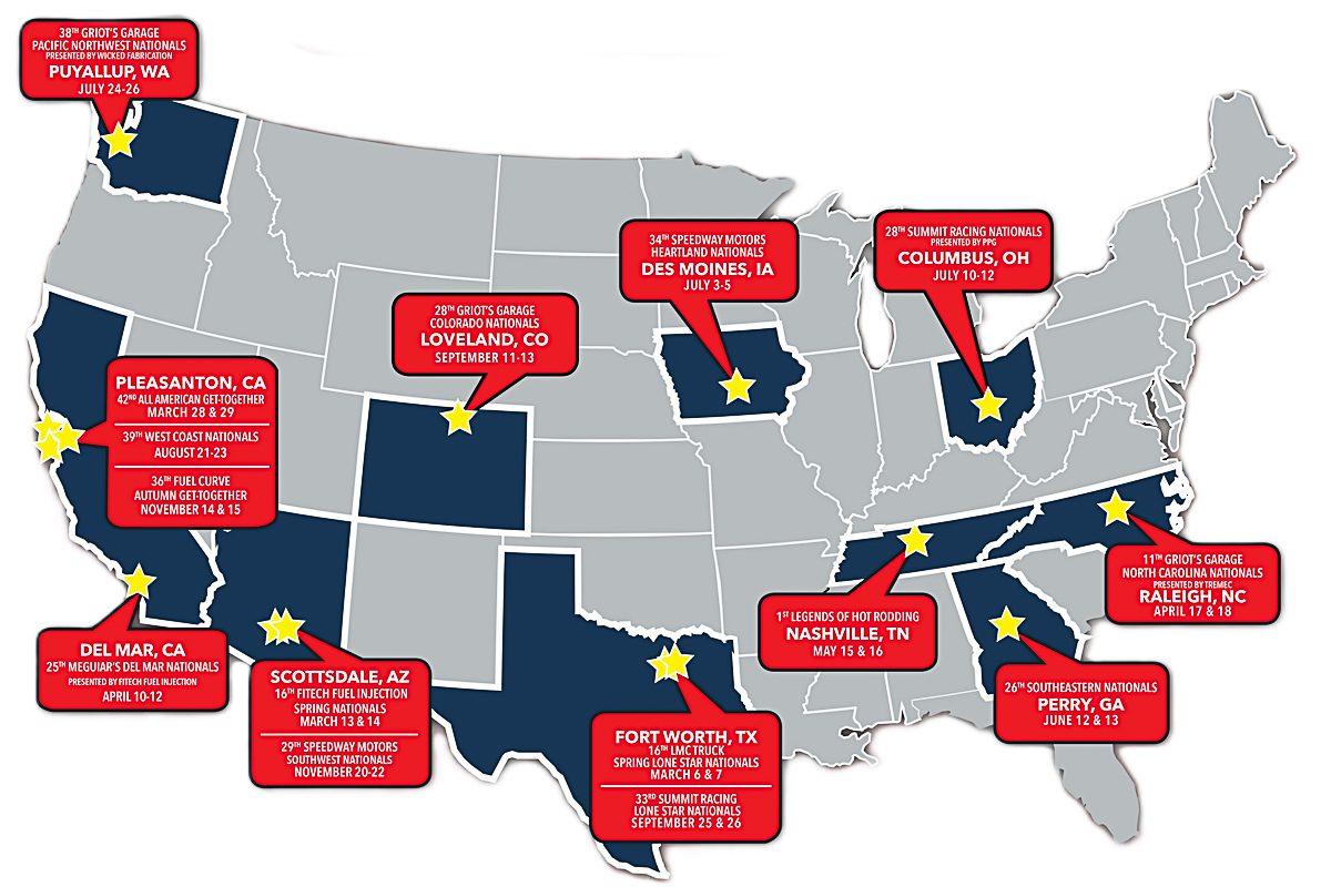 Goodguys popular three-event summer swing commences on the 4th of July weekend in Des Moines, Iowa, for the 35th Speedway Motors Heartland Nationals. This fan favorite event brings over 5,000 specialty vehicles together over Independence Day weekend with holiday festivities and a spectacular fireworks display Saturday night. The following weekend it’s on to Columbus, Ohio, for the 28th Summit Racing Nationals. With construction due to be fully completed at the Ohio Expo Center, and a new host hotel region being planned in nearby Dublin, this show is sure to be one of the biggest hot rodding events of the year! Columbus also is where Goodguys gives away its 2026 Grand Prize ’40 Ford Coupe built by Roseville Rod & Custom and selects two of our “Top 12 of the Year” awards; the 2026 Street Machine and Classic Instruments Street Rod of the year. To close out July, Goodguys heads to Washington state July 24 - 26 for the 38th Griot’s Garage Pacific Northwest Nationals presented by Wicked Fabrication with late night cruising and a packed burn-out competition.