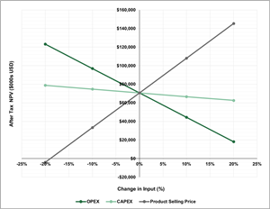 A sensitivity analysis was conducted on the after-tax NPV of the project using the following variables: product sales price, operating cost, and total capital cost. The analysis revealed that the project is most sensitive to changes in product sales price. The results of the sensitivity analysis are presented graphically in Figure 1.